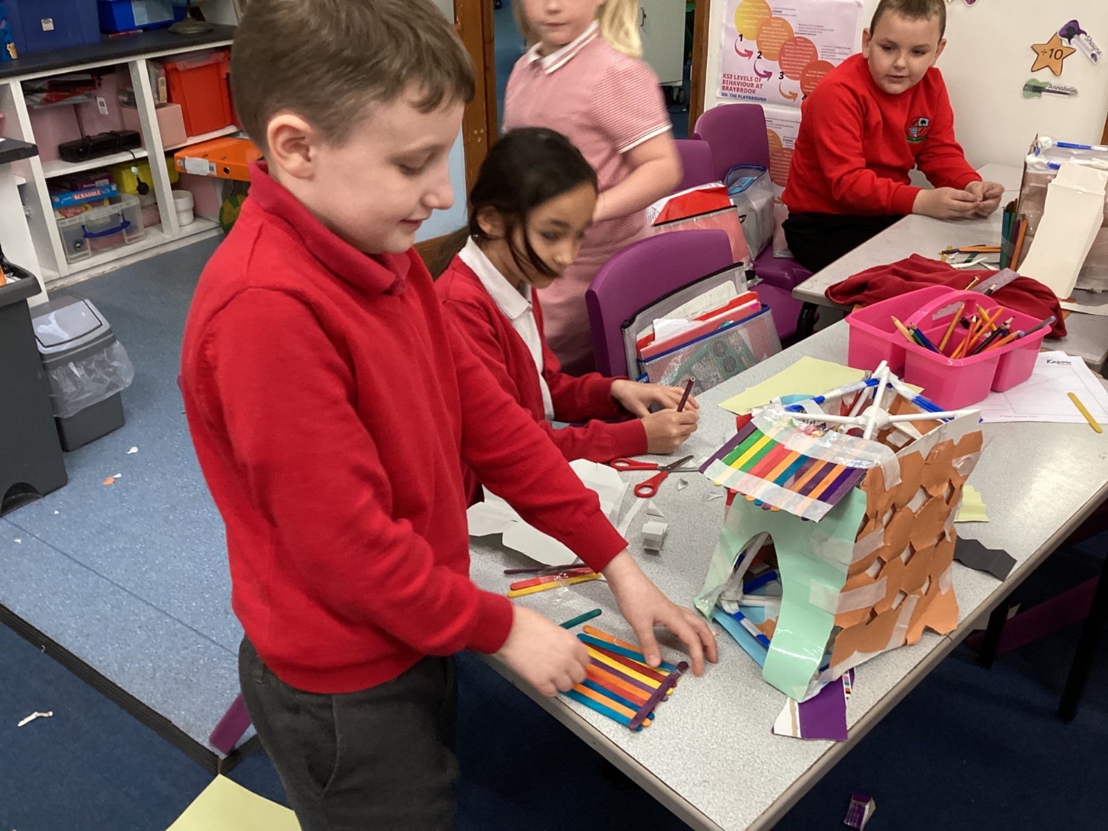 In DT, we enjoyed designing and building our own reading pavilions for our school grounds. We have researched existing structures in school and online, used marshmallows and cocktail sticks to make our structures as stable as possible before making our final design structure from straws and decorating it using different paper folding and cutting techniques.Some of us even created furniture inside!